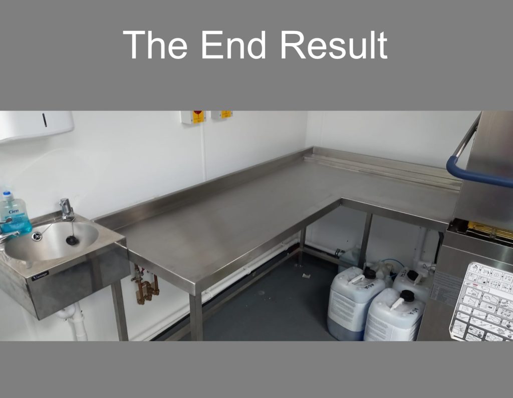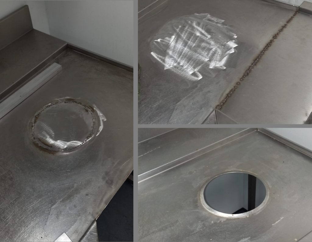 Our customer who has a very busy kitchen with over 800 cover per day requested some onsite alterations to their dishwash area, they were looking to create a better work flow for their staff. The bin chute on the inlet tabling was the first thing to be addressed, the hole was filled in, welded and polished, then existing tabling was joined, welded and polished to create an L shape work space. Additionally, new hole was cut and the bin chute was re-positioned at the end of the tabling.